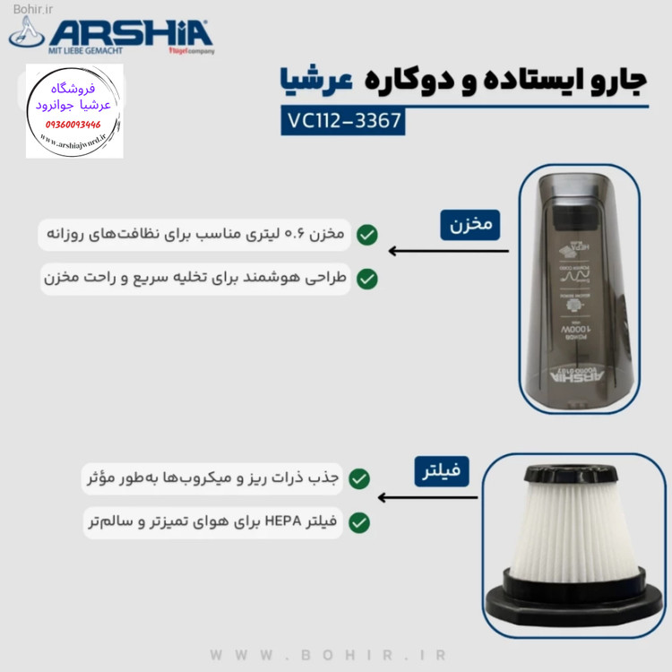 - جاروبرقی عرشیا مدل VC112-3367 به همراه لوازم جانبی مختلف، از جمله نازلهای مخصوص برای سطوح مختلف، ارائه میشود. این لوازم جانبی به نظافت هر چه بهتر و دقیقتر در مکانهای مختلف کمک میکنند.