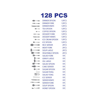 - مجموعه گسترده برای هر مناسبت: ۱۲ چنگال غذاخوری، ۱۲ چاقوی غذاخوری، ۱۲ قاشق غذاخوری، ۱۲ چنگال سالاد، ۱۲ قاشق چایخوری، ۱۲ قاشق قهوه، ۱۲ چنگال دسر، ۱۲ قاشق بستنی، ۱۲ قاشق یخ، ۲ چنگال برنج، ۲ چنگال گوشت، ۲ قاشق سبزیجات، ۱ ملاقه سوپ، ۱ چنگال سالاد، ۱ ملاقه سس، ۱ قاشق سالاد، ۱ قاشق کیک، ۱ قاشق شکر، ۱ انبر قند، ۱ قاشق سوپخوری، ۱ قاشق سوپخوری، ۱ قاشق عسل.