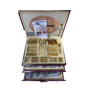 - این مجموعه شامل ۱۲ چنگال غذاخوری، ۱۲ چاقوی غذاخوری، ۱۲ قاشق غذاخوری، ۱۲ چنگال سالادخوری، ۱۲ قاشق چایخوری، ۱۲ قاشق قهوهخوری، ۱۲ چنگال دسرخوری، ۱۲ قاشق بستنیخوری، ۱۲ قاشق یخ، ۲ چنگال برنجخوری، ۲ چنگال گوشتخوری، ۲ قاشق سبزیجات، ۱ ملاقه سوپخوری، ۱ چنگال سالاد، ۱ ملاقه سس، ۱ قاشق سالاد، ۱ قاشق کیکخوری، ۱ قاشق شکر، ۱ انبر قند، ۱ قاشق سوپخوری و ۱ قاشق عسل است.