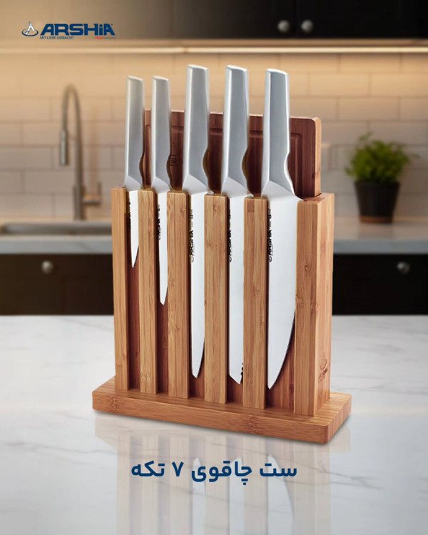 سرویس چاقوی 7 تکه عرشیا به همراه پایه و تخته برش از جنس اقاقیا مدل KS112-3659