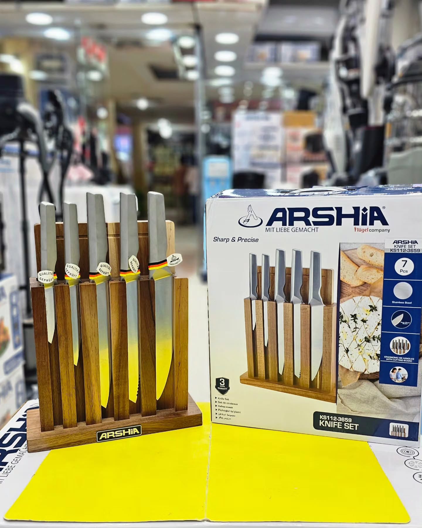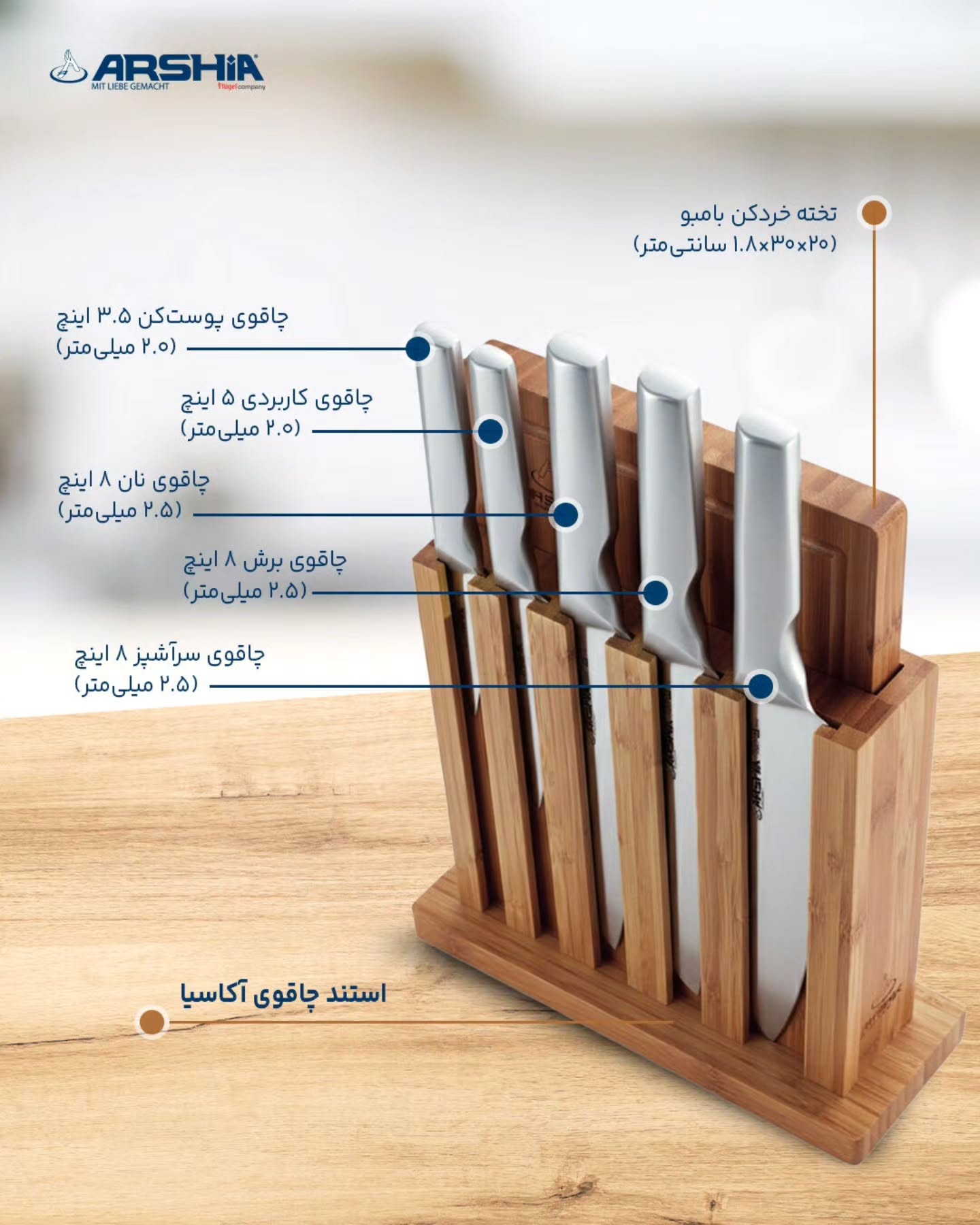 سرویس چاقوی 7 تکه عرشیا به همراه پایه و تخته برش از جنس اقاقیا مدل KS112-3659