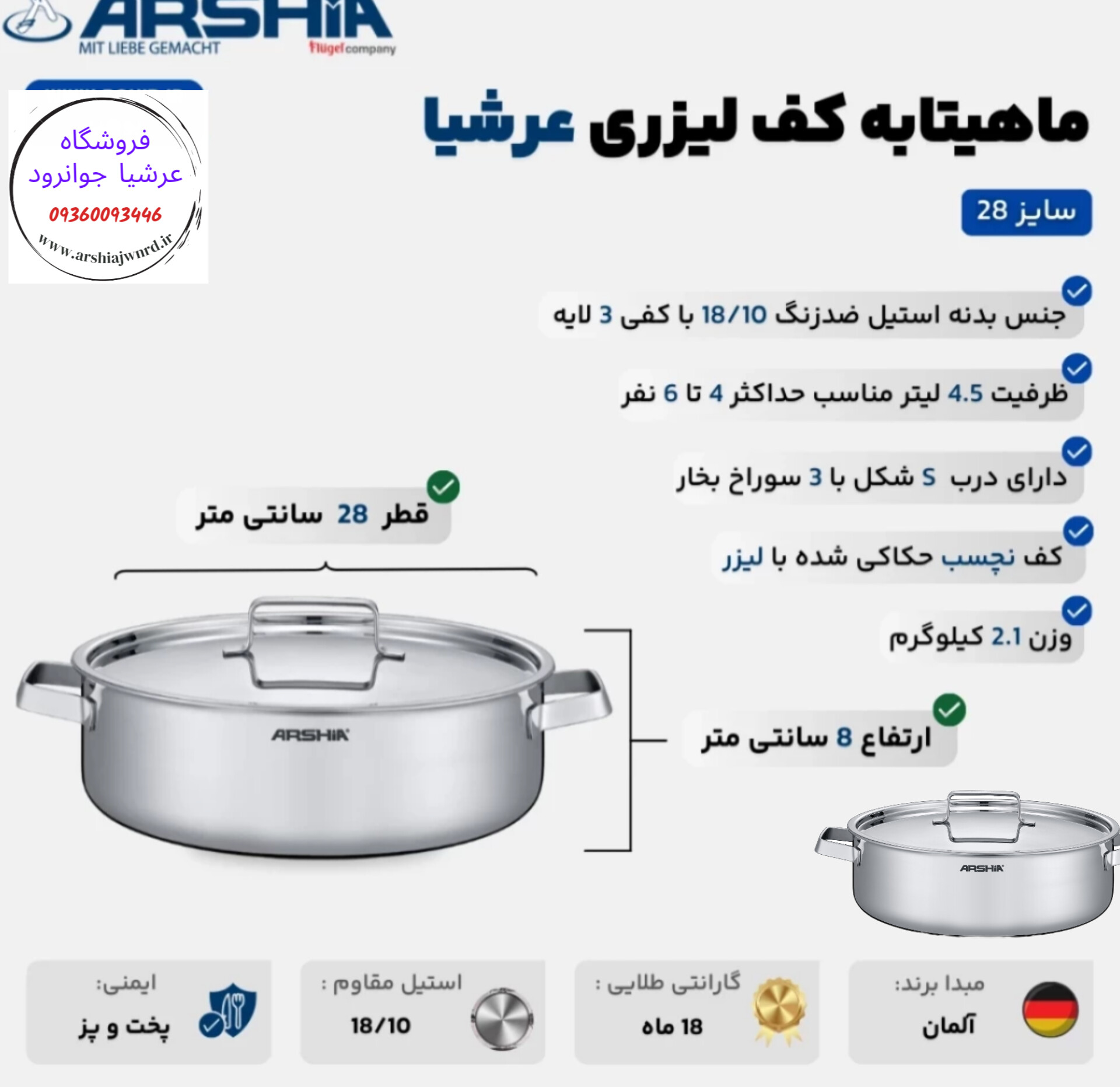 - تابه کمعمق ۲۸ × ۸ سانتیمتر با درب استیل ضد زنگ