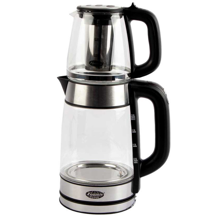 با این دستگاه با خیال راحتی می توانید نسبت به دم کردن و تهیه چای اقدام نمایید. از نکات مثبت این دستگاه در کتری از نوع قفلشونده است که به هنگام قرار دادن آن روی کتری دیگر نگران آفتادن آن نخواهید بود.به این ترتیب که هنگام قراردادن و برداشتن آن از روی کتری باید کلید اطمینان آن را فشار داده تا قفل و یا باز شود.هـنگام دمکـردن چـای بـه خـاطر وجـود بـخار بـا درجهی ۹۰ کـه قـوری روی آن قـرار گرفته چای بهخوبی دم میکشد. حجم آب در این قوری و کتری به تربیت ۱٫۷ و ۱ لیتر می باشد .چای ساز زومیت در مقایسه با تمامی مدلای هم رده خودش از رتبه بسیار بالا و در حال حاظر یکی از محبوب ترین چای ساز های بازار به حساب می آید تیم فروشگاهی جـوانرود آنلاین خرید این چای ساز را به شما توصیه می کند
