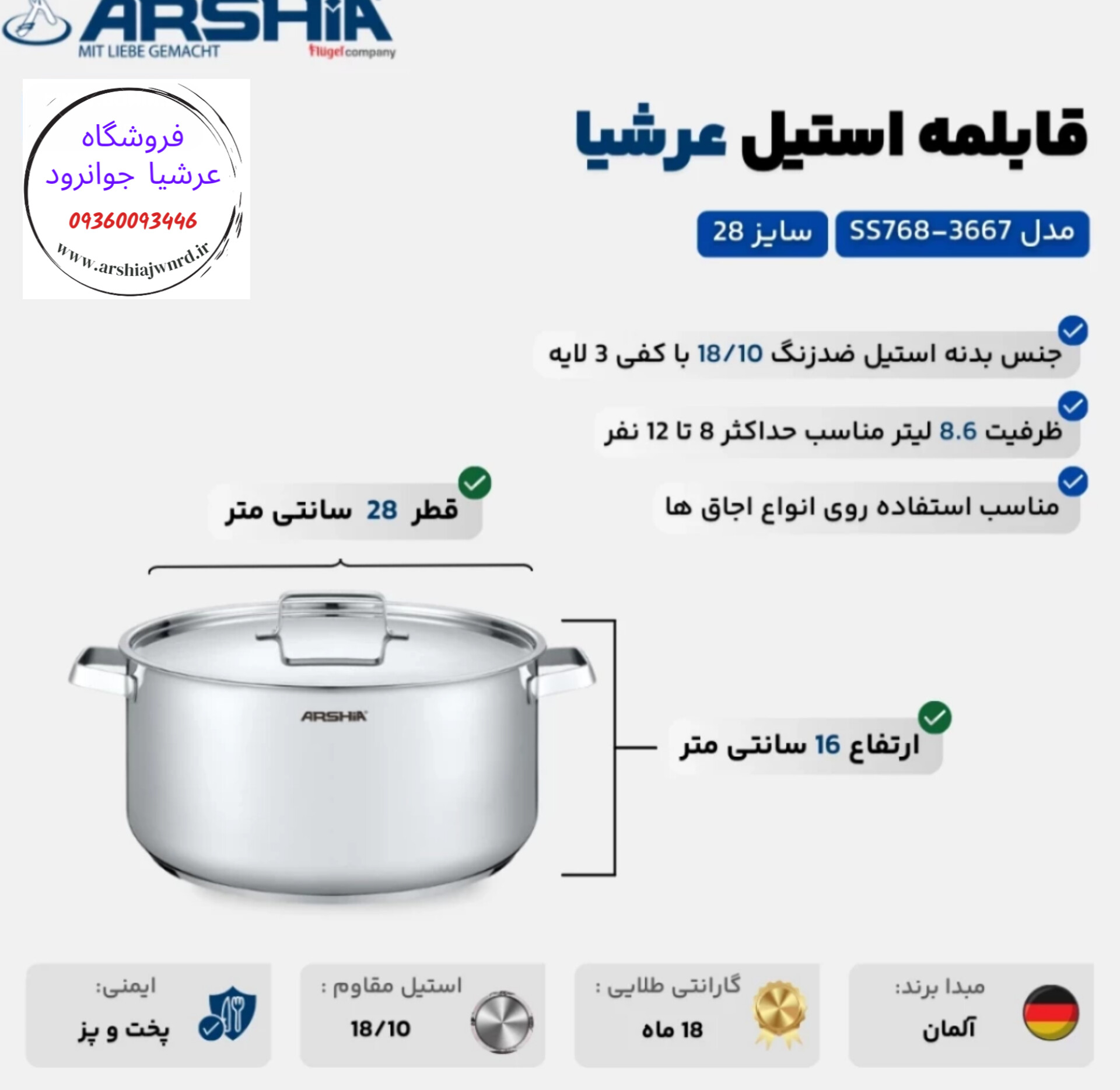 - قابلمه استیل سایز 28 سانت عرشیا