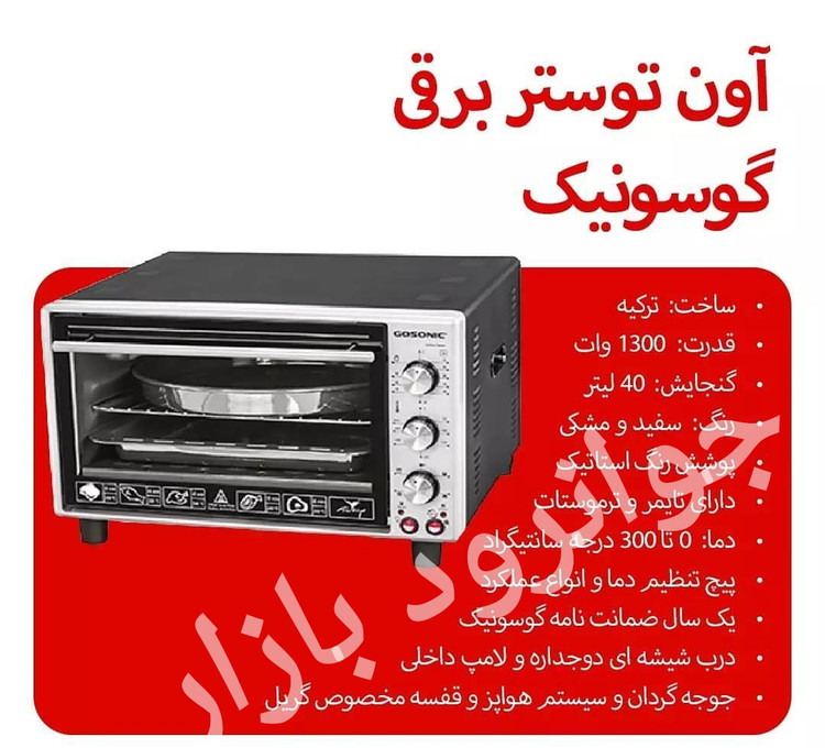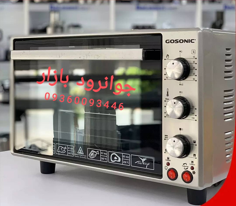 آون توستر 40 لیتری گوسونیک GOSONIC مدل GEO-640. با توان مصرفی 1300 وات دستگاهی با طراحی شیک و کاربرد آسان است که جهت پخت و پز انواع مواد غذایی شامل غذاهای گوشتی، نان، صیفی جات و غیره قابل استفاده می باشد. این دستگاه مجهز به محفظه پخت با پوشش رنگ استاتیک و گنجایش 40 لیتری همراه با جوجه گردان و سیستم هواپز است که می توان تا 5 کیلوگرم گوشت، ماهی یا مرغ را روی در آن قرار داد، همچنین می توان انواع مواد غذایی مانند گوشت، ماهی و سبزیجات را بر روی سینی یا قفسه مخصوص گریل قرار داده و کباب تمایید. در محفظه داخلی دستگاه چهار المنت حرارتی تمام استیل به صورت دو المنت در بالا و دو المنت در پائین قرار گرفته اند و هنگام کارکرد دو چراغ نشانگر روشن بودن المنت های بالا یا پایین را به شما نشان خواهد داد.
