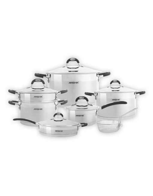 سرویس قابلمه استیل عرشیا مدل SS1401 1755 یک سرویس ایدهآل و منحصر به فرد برای هر آشپزخانهای بوده که به لطف آنها میتوانید مانند یک سرآشپز حرفهای باشید. این سرویس دارای ۱۲ پارچه است که شامل؛ یک عدد قابلمهی بزرگ، ۲ عدد قابلمهی متوسط، یک عدد ماهیتابه یک دستگیره، یک عدد ماهیتابه ۲ دستگیره، یک عدد شیر جوش و یک توری سرخکن میباشد. دستگیرههای این سرویس دارای رنگ مشکی و از جنس فنولیک بوده که عایق حرارت میباشد و از هر گونه آسیب احتمالی به هنگام داغ بودن قابلمهها جلوگیری میکند. این دستگیره ها تا دمای ۱۸۰ درجه سانتیگراد داغ نشده و آسیب نمیبینند. رنگ این سرویس نقرهای بوده که متناسب با هر خانه و سلیقهای است.