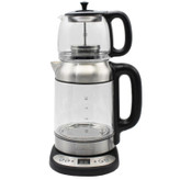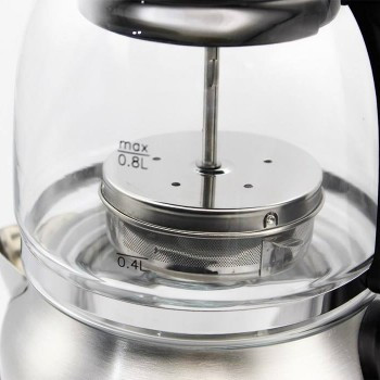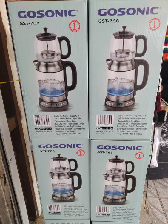 چای ساز گوسونیک مدل GST-768 دارای بدنهای به رنگ سیلور/مشکی بوده که سبب نمای زیبایی در آشپزخانه و یا محل کار شما میگردد. این دستگاه از جنس استیل ضد زنگ و پلاستیک عایق بوده و دارای ماندگاری بالایی است. کتری و قوری نیز از جنس شیشهی پیرکس است که کاملا شفاف بوده و میتوانید میزان آب و چای داخل آنها را مشاهده کنید. گنجایش کتری ۱.۷ لیتر و گنجایش قوری ۱ لیتر است که به کمک این گنجایش میتوانید به راحتی ۱۲-۱۵ فنجان چای آماده کنید. ابعاد این چایساز ۲۱×۱۷×۳۸ سانتیمتر است و بر روی یک قسمت از کابینت به راحتی جای میگیرد. بر روی کتری چراغ LED نمایشگر قرار گرفته است و در صورتی که آب داخل آن به جوش بیاید، چراغها روشن میگردند. پنل کنترلی این چایساز دارای ۶ عدد دکمه بوده که دسترسی و کنترل دستگاه به کمک آنها انجام میگردد. قوری این دستگاه دارای یک فیلتر از جنس استیل ضد زنگ بوده که تفالهی چای را میگیرد. قسمت های مختلف در این دستگاه قابل جدایی بوده که میتوانید آنها را بشویید.