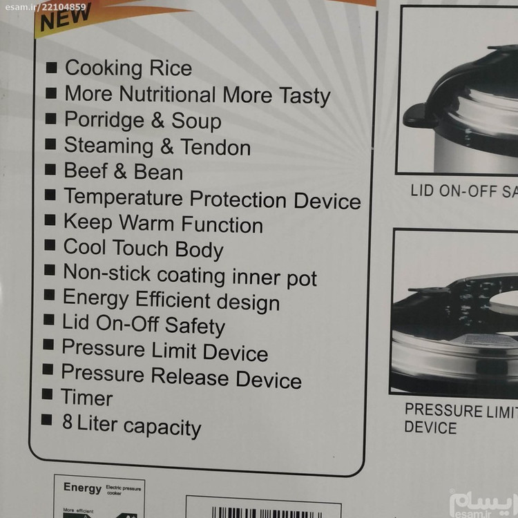 روکش داخلی بدنه ورق آلومینیوم روکش گرانیت. دیگ قابلمه سرامیکی. ظرفیت به تعداد 8 تا 10 نفر. قابلیت خروج بخار به صورت فشار مستقیم. قابلیت گرم نگهدارنده