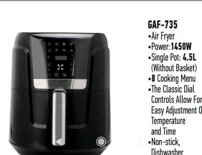 یکی از سرخ کن های بدون روغن مدل GAF-735 گوسونیک است که دارای توان 1450 وت است و همین موجب میشود بتوانید هر نوع خوراکی را به کمک آن سرخ کنید. ظرفیت 4.5 لیتری این دستگاه برای خانواده های متوسط و کم جمعیت مناسب است. 8 برنامه از پیش تعیین شده این سرخ کن را محصولی پرطرفدار کرده است که بدون کمترین مشکلی بتوانید مواد غذایی مورد نیازتان را بدون کمترین روغن ممکن سرخ کنید.