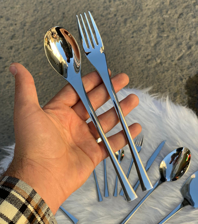 ۲۴ قاشق، ۲۴ چنگال، ۱۲ کارد میوه، ۱۲ مربا خوری، ۱۲ شربت خوری، ۱۲ بستنی خوری، ۱۲ چایی خوری، ۱۲ چنگال میوه، ۴ ملاقه بزرگ، ۴ کفگیر بزرگ، ۲ عدد سوپ خوری، ۲ عدد کفگیر کوچک