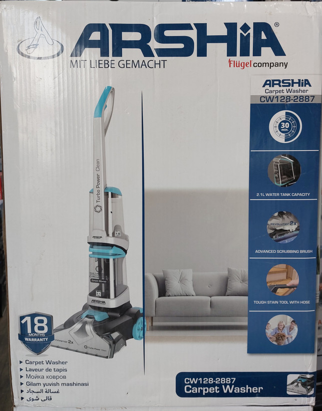 قالی شوی عرشیا مدل 2925-CW128 دستگاهی با قدرت بالا است که به کمک موتور قدرتمند توربو میتواند فرشهای شما را در زمانی کوتاه تمیز نماید. این قالی شوی دارای توان مصرفی ۸۰۰ وات میباشد که با قدرت مکش زیاد سبب تمیز شدن عمقی فرشهای تراکم بالا میگردد. فناوری Heat Force در این دستگاه موجب میشود فرشها در ۳۰ دقیقه خشک شوند و محیط خانه بدون به هم ریختگی تمیز شود. نازل مکش در این سیستم با قدرت بالا میتواند کثیفی را از عمق فرشها بیرون بکشد.