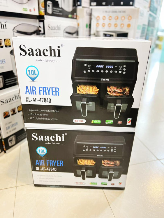 سرخ کن بدونروغن دوقلو ساچی مدل NL-AF-4784D محصولی شیک ازکمپانی ساچی است که با کاهش ۸۰ درصدی مصرف روغن، غذاهای شما را به صورت کاملا سالم آماده میکند. این دستگاه بینظیر با توان مصرفی ۲۲۰۰ وات باعث آماده شدن انواع غذاها در کوتاهترین زمان میگردد. گنجایش مخزن در این سرخ کن ساچی ۱۰ لیتر است که شامل ۲ سبد بزرگ ۵ لیتری بوده و به کمک آن میتوانید دوستان و خانواده را به صرف یک وعده غذای لذیذ دعوت نمایید. پنل کنترلی در این دستگاه به صورت لمسی طراحی شده است و تنها با یک لمس غذاهای دلخواه شما آماده میگردند. سرخ کن بدونروغن دوقلو ساچی مدل NL-AF-4784D مجهز به سیستم تایمر و تنظیم دما بوده که کار را برای کاربر آسان پیش میبرد. به کمک برنامه پخت از پیش تعیین شده میتوانید خوشمزه ترین غذا ها را در زمانی کوتاه آماده نمایید. به کمک این سرخکن میتوانید انواع غذا ها مانند؛ گوشت و ماهی کبابی، مرغ و میگوی سوخاری، سیب زمینی سرخ شده، قارچ خوشمزه، بخارپز کردن سبزیجات و ... را آماده کنید و همچنین انواع غذای منجمد را گرم نمایید.