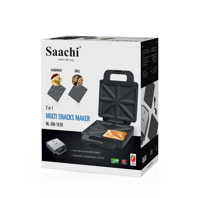 ساندویچ ساز ۲ کاره ساچی مدل NL-2M-1570 دستگاهی از کمپانی ساچی است که با توان مصرفی ۱۴۰۰ وات موجب آماده شدن ساندویچ، نان توست و ... در زمانی کوتاه میشود. این دستگاه دارای قابلیت خاموش شدن خودکار است و موجب صرفهجویی در مصرف انرژی و افزایش طول عمر آن میگردد. این دستگاه دارای ۴ صفحهی متنوع از جنس نچسب تفلون بوده و برای آماده کردن انواع موادغذایی بسیار کاربردی میباشد. این صفحات به آسانی قابل جدا شدن بوده و میتوانید آنها را شستشو دهید. سیستم خاموشی خودکار در این سیستم در صورتی که دستگاه بیش از حالت عادی داغ گردد، ساندویچساز را خاموش نموده و سبب افزایش طول عمر دستگاه میگردد.