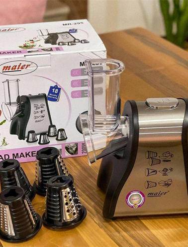 امروزه استفاده از وسایلی که امر آشپزی را آسان کنند بسیار ضروری و مهم است مخصوصا لوازمی که کار را سریع تر کرده نیز بسیار پر طرفدار هستند. افرادی که زمان کافی برای آشپزی ندارند، از چنین محصولاتی که کارهایشان را سریع تر پیش ببرد بسیار استقبال میکنند. یکی دیگر از دستگاه هایی که سبب آسان شدن آشپزی میگردد سالادساز های برقی بوده که عملکرد آنها مانند غذاساز ها است. یکی از برند های فوقالعاده و خوشنام این محصولات را تولید کرده است، برند مایر بوده که در ادامه به بررسی این محصول میپردازیم. سالاد ساز مایر مدل MR-295 یک دستگاه حرفهای برای خرد و پوره کردن موادغذایی بوده که کارها به کمک آن بسیار آسان و سریع پیش میرود. توان مصرفی که برای این دستگاه اختصاص داده شده است ۲۰۰ وات بوده که خرد کردن را در زمانی کوتاه برای شما انجام میدهد. این دستگاه در رنگ مشکی/ سیلور موجود بوده و میتوانید آن را به سادگی با سایر لوازم خود در آشپزخانه ست کنید.
