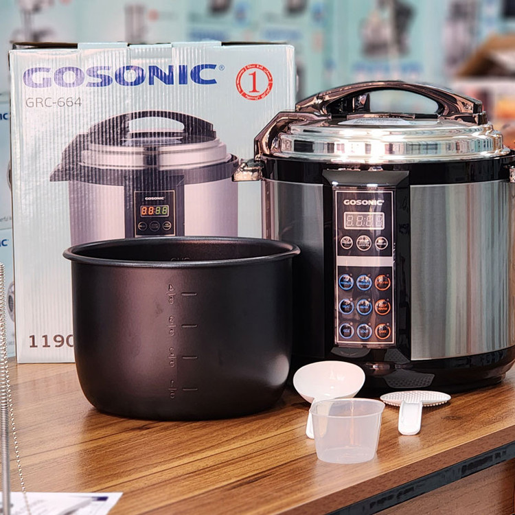 زودپز گوسونیک مدل GRC-664 ظرفیتی ۶ لیتری داشته که یکی از زودپزهای با ظرفیت متوسط است و همین امر آن را بین محصولات مشابه پرطرفدار کرده است که میتوانید غذای مورد نیاز خانوادهای متوسط را تدارک ببینید. توان ۱۱۹۰ وات این زودپز برقی نشان از قدرت بالای آن داشته که در مدت زمان کوتاهتری غذاها را به کمک آن آماده نمایید. یکی از ویژگیهای این زودپز برقی گوسونیک سیستم گرم نگهدارنده بوده که غذاها را مدت زمانی طولانی برای سرو گرم و آماده نگه میدارد. سیستم خاموش شدن خودکار که برای این زودپز تعبیه شده از روشن ماندن طولانی مدت دستگاه جلوگیری کرده و پس از اتمام زمان تعیین شده به صورت خودکار خاموش میشود. این زودپز گوسونیک مجهز به تایمر ۲۴ ساعته بوده که میتوانید زمان پخت را تا ۲۴ ساعت بعد تنظیم نمایید. همچنین ۱۰ برنامه پخت که برای این زودپز تعبیه شده است آن را محصولی همه کاره کرده که میتوانید به کمک آن غذاها را به راحتی یک لمس آماده کنید.
