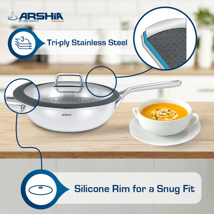 سایر توضیحاتدستههای ارگونومیک و خنک کف سه لایه با هسته آلومینیومی برای انتقال یکنواخت حرارت مناسب انواع اجاقها (گازی، القایی، برقی، سرامیکی)