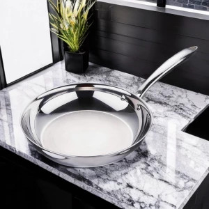 یکی از مهمترین ویژگیهای این ماهیتابه، جنس بدنه استیل ضدزنگ 18/10 آن است که مقاومت فوقالعادهای در برابر زنگزدگی، خوردگی و خطوخش دارد. این نوع استیل نهتنها ظاهر براق و زیبا دارد، بلکه با دوام بالا، برای استفاده روزمره بسیار مناسب است. ساختار سهلایه (Tri-Ply) این ماهیتابه باعث شده تا حرارت بهصورت یکنواخت در تمام سطح پخش شود و از ایجاد نقاط داغ جلوگیری شود. اگر بهدنبال خرید ماهیتابه استیل با کیفیت بالا هستید، این مدل عرشیا گزینهای بینظیر است.